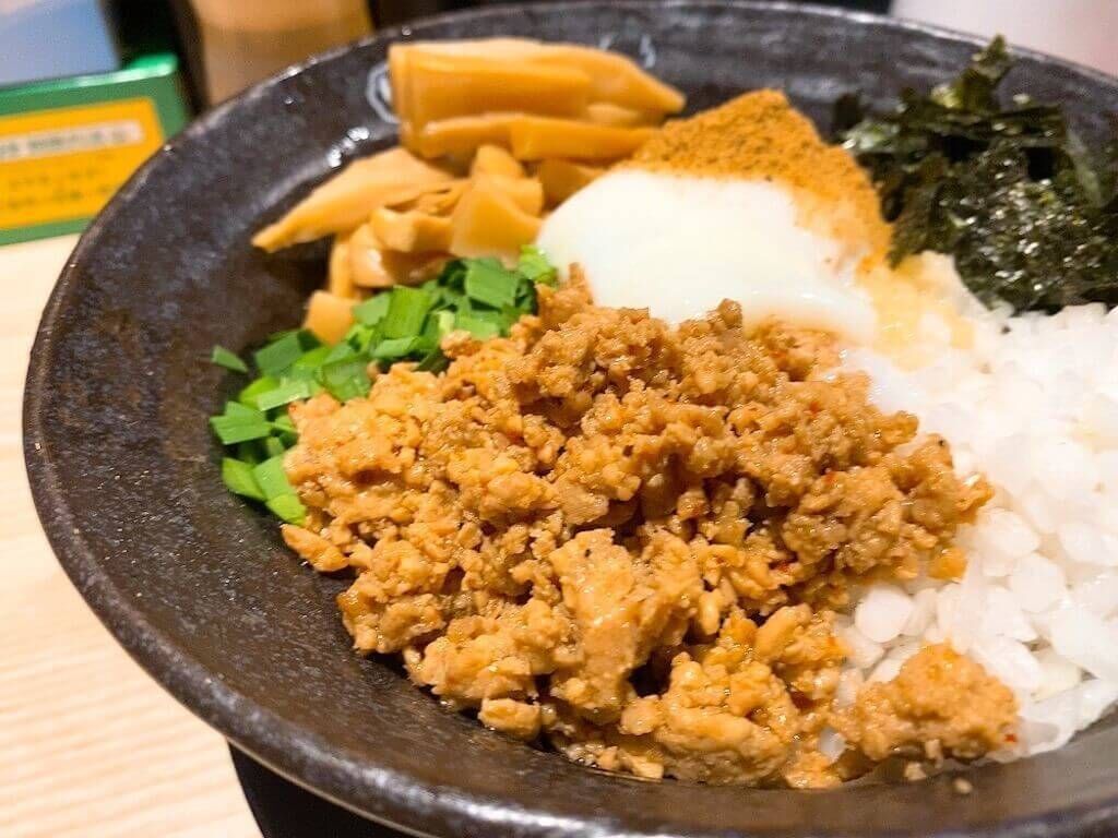 甘辛の鶏そぼろがたくさん入っており、とても美味しかったです。かなり濃い味付けで旨味が強く、このまぜそばの主役とも言えるくらい存在感があります🌟