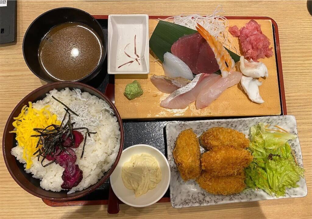 念願のご対面。お刺身、カキフライ、ご飯、味噌汁とかなりボリューミー🐟
